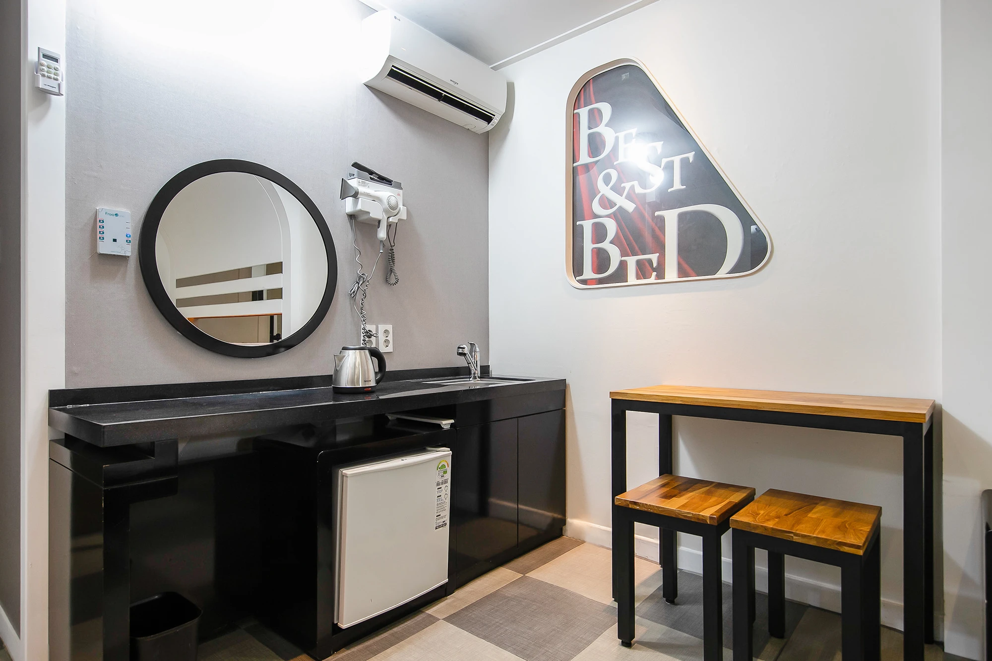 - 집기품목 : 타월, 커피포트, 침대방, 욕조, 와이파이, 에어컨, 세면도구, 샴푸, 비데, 바디워시, 린스, 드라이기, 냉장고, TV, 욕실용품